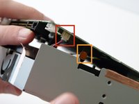 Before unscrewing the optical drive enclosure, the small cable on the left of the drive (when looking at the device from the back) needs to be disconnected from the circuit board (the orange one).
