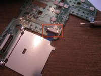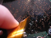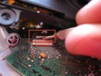 • Now to remove the laser reading assembly. Carefully peel the orange data ribbon off the circuit board to the plug. Using the flat screwdriver, pry the black clip away from the tan part.