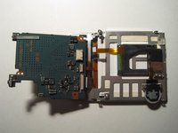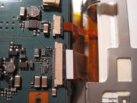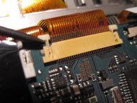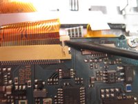 The next step involves separating all of the various ribbon wires from the screen and circuit board. There are 5. The first wire is the ribbon wire that connects the memory card to the circuit board. I pulled it out with my screwdriver like shown but I am sure that black piece of plastic piece could have been moved to release the wire from the connectors mighty grip.