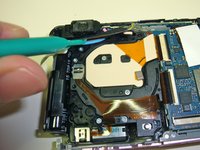 The lens assembly is held in place solely by the ribbon cables at this point. Once you have removed the ribbons, the entire lens assembly will easily lift free of the rest of the camera.