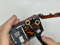 Disconnect the flat ribbon cable that connects the motherboard to the lens assembly with tweezers.