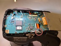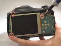 Using a screwdriver, remove the three 4mm screws that attach the LCD to the camera motherboard (The LCD is contained in a holding plate, attached to the motherboard with a ribbon cable).