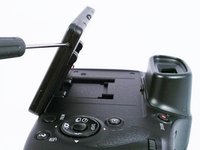 Turn the camera on its side to access the last remaining 2 cm Phillips head screw holding the LCD case together.