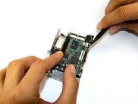 Remove the one 2.5mm Phillips #000 screw on the bottom corner of the motherboard.
