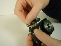 Once the case is off, hold down the ribbon near the LCD screen that connects the flash to the camera. While doing this, carefully lift the control board that contains the flash until the ribbon is no longer connected.