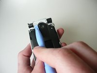 Use the opening tool to pry up the edge of the remaining silver hinge cover. Once it is loose, pull it off the rest of the way