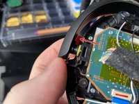 • There are soldered NC microphone cables directly below the headband cable that may also be stuck to the tape. Be very gentle during this process, making sure you gently unstick the tape from these cables as you peel the headband cable away.