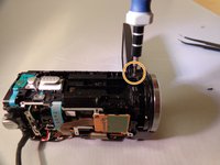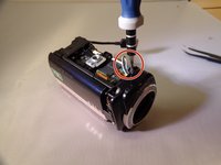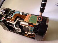 Rotate the camera back to the other side and remove the 5mm screw to the left of the record button.