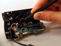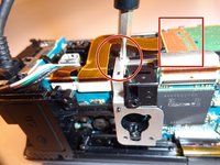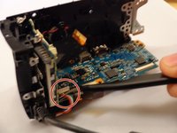 Orient the camera to the side opposite of the recording buttons where the leather strap was. Locate the orange motherboard and remove the three nearby 5mm black screws and 4mm silver screw.