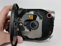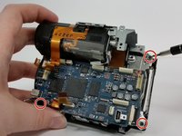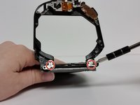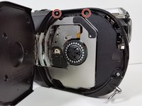 • Now that all of the cables are disconnected, remove the two bronze screws (2mm, Phillips #00) on the lens housing.
