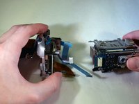 While securing the device with your left hand, use gentle rightward pressure with a plastic opening tool to pop off the shutter assembly. To do this, position the plastic opening tool in the slot labeled in photo one. A close up of the shutter assembly in the picture might help also.