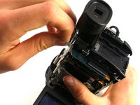Pry the left panel out at an angle by pushing the plastic slat between the battery slot and the eyepiece.