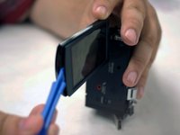 Rotate the camera so the LCD side panel is facing you and gently pry the shell off from the camera.