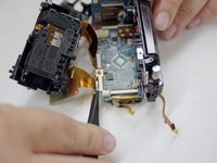 Orienting the camera such that the front side is facing you, remove the ribbon connecting the start and zoom buttons to the powerboard using your tweezers.