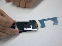With tweezers, remove the ribbon cable that is connecting the LCD screen board to the motherboard.
