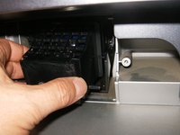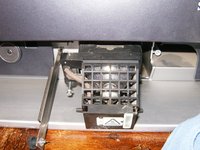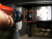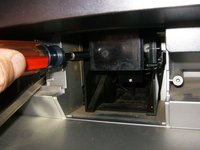 With the bezel out of the way, there will be a small cover held in place by a crossbar and a thumb screw. Loosen the thumb screw and fold the bar out of the way.