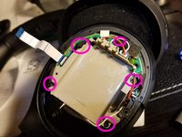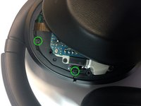 After removing the ear foam cup, you will see a piece of circular foam. Gently lift the top to locate 2 screws and lift the bottom to locate another 2 screws.