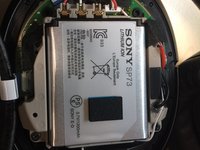 The battery on mine is a model: Sony SP73, 3.7V, 1200mah Li-ion battery. The battery is held on by adhesive.