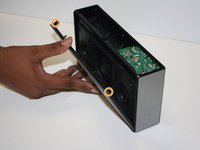 Remove the front panel to the speaker by pushing on the two tabs in the corners.
