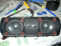 Remove the 4 x No. 1 Phillips screws from the top of the speaker as highlighted in the first photograph. Place the screws in your screw container.