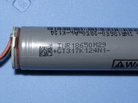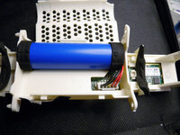 The third and final picture shows the original battery with the cover removed! It's a INR18650 3.7V battery with a charge controller PCB mounted on top. Theoretically, you could break off the zinc-plated connectors and use a battery spot welder to weld them and the PCB to a new battery, then Heat shrink cover it!
