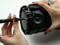 Unclip all six trapezoid-shaped notches around the rim of the speaker using the metal spudger.