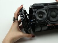 Uncap the left bass radiator. Detach the blue ribbon cable from the bass radiator.