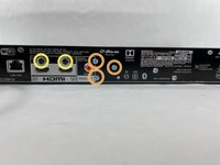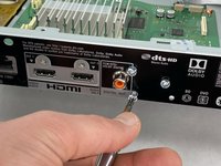 Use a Phillips #2 screwdriver to remove the two 10.5 mm screws (one next to the Wi-Fi logo and one next to the Blu-ray logo).