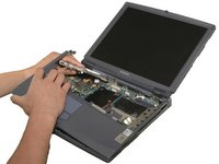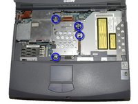 Slide the blue speaker grille (located above the keyboard) to the right and gently pull upward. The grille will still be connected by a white electrical strip.