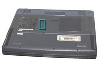 If you are looking at the bottom of the laptop the battery is located on the front right side of the laptop; the opposite side from the floppy disk drive.