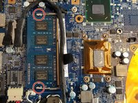 Push down on the metal prongs encircled to allow the RAM component to spring up diagonally from the lab top.