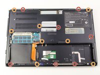 Remove seven 3mm Phillips #0 screws from the bottom of the computer.