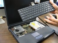 To remove the keyboard, lift it a few inches from the computer, taking care not to pull beyond the length of the ribbon cable that secures it to the motherboard.