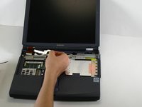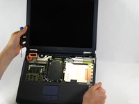 Slide the speaker panel towards the left, then carefully flip it over onto the keyboard.