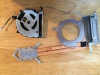 Undo three bits of black tape holding down various wires connected to the fan and heatsink. Lift up the corner of the battery next to the outside of the case. Lift the corner of the fan so it's above the corner of the battery (or you can just remove the battery altogether; that might be easier).