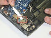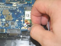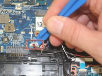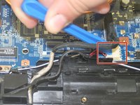 Use a plastic opening tool to unsecure the white speaker wire connector on the motherboard.