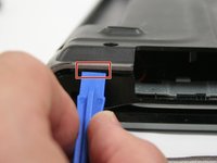 Use a plastic opening tool to carefully pry open the latch points located under the silver plastic trim. Repeat this around the back cover.