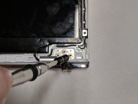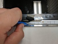 Using a pry tool, separate the plastic housing that holds the hinges in place from the display panel.