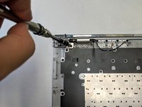 Pry open the housing of the display cable in order to completely remove it from the top panel of the laptop.