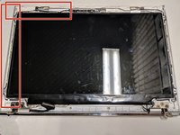 Unscrew the two 5mm Phillips head screws that secure the two display hinges to the back panel of the laptop.