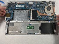 Grab the edges of the motherboard and lift the it slowly up and away from the back panel of the laptop.