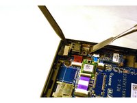 Insert the tip of a spudger where the upper screw was located and push the board inward while prying up with the plastic opening tool.