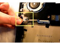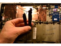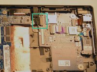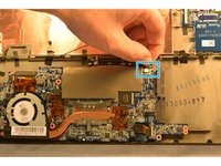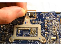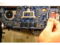 Gently pull the motherboard out by pulling from the right side of the board and flip it so that the motherboard now sits where the battery was and the underside is now visible.