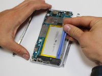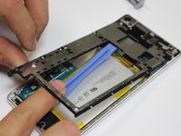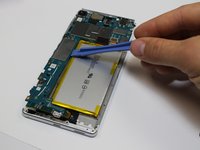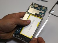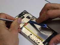 Carefully remove the back panel of the phone with a plastic spudger, or other flat and thin wedge tool. Work your way around the perimeter of the case, loosening and prying gently, until there is sufficient distance between the panel and phone.