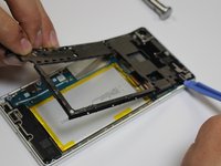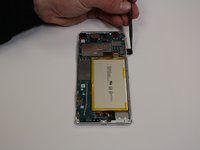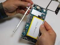 Working from bottom to top, gently pry the motherboard off of the phone .