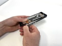 Using a spudger, carefully remove the thin copper piece attached to the motherboard.