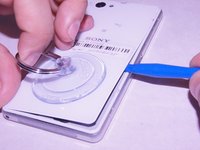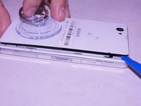 Pull up on the suction cup and insert the plastic opening tool in between the back cover and the rest of the phone.