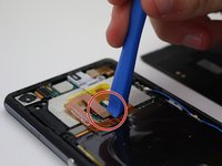 Use the plastic opening tool to gently pry off the two flex connectors from the motherboard. Getting access to one of the connectors requires prying off the other first, so be sure to remove the top connector first.