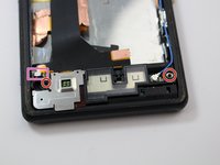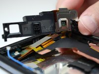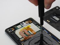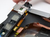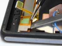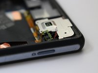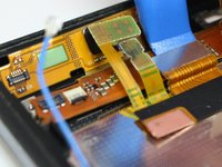 Turn your attention back to the inside of the device, where there is one group of cables connected to the display on the front of the phone. Maneuver these cables, as shown, through the hole so that the screen and cables can be removed from the device. The screen and attached cables will now detach from the phone.