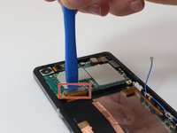 Slowly slip the halberd spudger underneath the rest of the orange flex cable to carefully peel the adhesive portion away from the rest of the phone.
